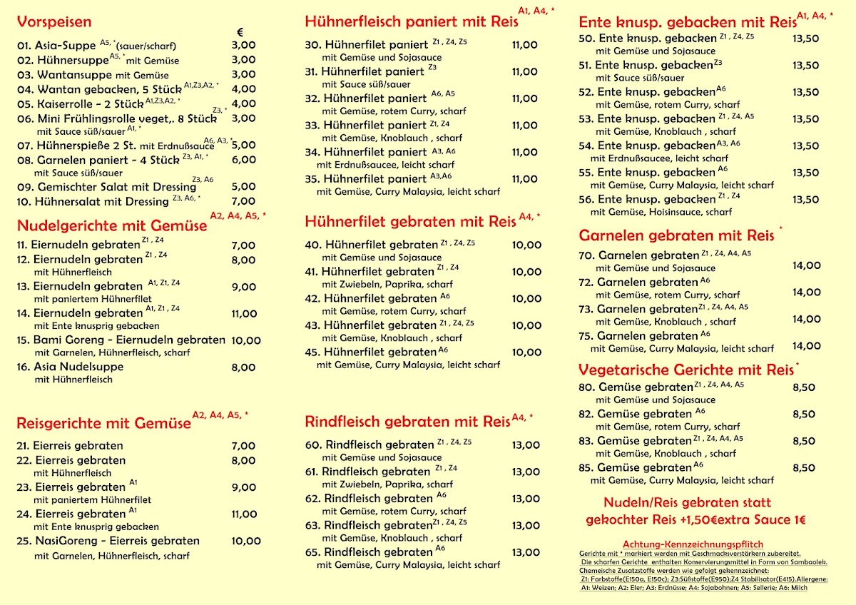 Asia Schnellimbiss offers a straightforward, comforting menu focused on quick, flavorful Asian takeout dishes. The selection centers around familiar favorites that combine fresh ingredients with approachable flavors—perfect for a casual lunch or a satisfying dinner on the go.